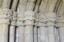 The plan of the church consists of a nave, with north and south aisles, and a long narrow chancel. Entering the church by the south porch, rebuilt in the nineteenth century, is the south doorway, a still-standing example of Early English architecture. This doorway, built of yellow sandstone, is deeply recessed and is composed of six shafts on either side. The north door opposite is much narrower and of simple design.[4]