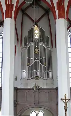 In Bach's time, St. Thomas Church had two organ lofts: the large organ loft that was used throughout the year for musicians performing in Sunday services, vespers, etc., and the small organ loft, situated at the opposite side of the former, that was used additionally in the grand services for Christmas and Easter. The St Matthew Passion was composed as to perform a single work from both organ lofts at the same time: Chorus and orchestra I would occupy the large organ loft, and Chorus and orchestra II performed from the small organ loft. The size of the organ lofts limited the number of performers for each Choir. Large choruses, in addition to the instrumentists indicated for Choir I and II, would have been impossible, so also here there is an indication that each part (including those of strings and singers) would have a limited number of performers, where, for the choruses, the numbers indicated by Bach in his 1730 request would appear to be (more than?) a maximum of what could be fitted in the organ lofts.[9]