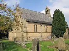 The walls are of yellow sandstone ashlar; it has a slate roof which has a lozenge pattern over the nave and a zig-zag pattern over the chancel. The chancel has a semicircular apsidal shape. There are buttresses at the corners of the church and against the chancel. On the roof at the junction of the nave and chancel is a bellcote.[1]
