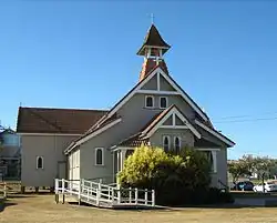 The main elevation (facing west) of the church is symmetrical in form with the entry porch projecting out from the main gabled structure. A timber-framed bellcote crowns the ridge of the main roof above the entry porch and is clad to match the main roof. Bracing fixed between the roofs' bargeboards form decorative ends to each of the projecting gable roofs. The entry porch is accessed via steps from the south and by a recent timber-framed ramp from the north. Decorative post brackets form arched openings on the porch which is enclosed to handrail height with weatherboards.[1]