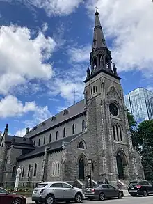 Design for the present church building started in 1869 under the direction of architect Augustus Laver.[3] Laver's firm, Fuller and Laver, also designed the East and West blocks of Ottawa's Parliament Buildings. In 1872, the cornerstone was blessed by Bishop Guigues (the first Bishop of Ottawa), and was laid by John A. Macdonald (the first Prime Minister of Canada). King McCord Arnoldi (architect) was responsible from 1874 to 1875 for the completion of the original design prepared in 1869 by Augustus Laver.[4]