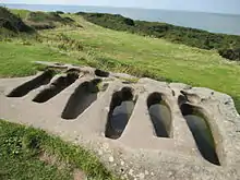 Near the chapel is a group of six rock-cut tombs from the 11th century and a separate group of two rock-cut tombs. Each group is listed at Grade I, and each tomb has an associated socket probably intended for a timber cross.[4][5] They featured on the cover of Black Sabbath's 2000 album The Best of Black Sabbath.[6]