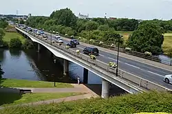 St Peter's Bridge crosses the River Trent between Burton and Stapenhill, carrying the A5189 road.[1][2] It was built between 1983 and 1985 to alleviate traffic flows on the Burton Bridge, 1.3 kilometres (0.81 mi) to the north, is crossed by around 24,000 vehicles a day.[1][2] The owner, Staffordshire County Council, originally considered it to comprise five separate structures: the western appoarch embankment with flood relief culverts; the western section of bridge ("Pumphouse Viaduct") over the Washlands, a flood plain; the main span across the river; the portion on the eastern bank ("Stapenhill Underpass") and a footbridge ("St Peter's Footbridge") which crosses over the structure on the Stapenhill side.[2] Since April 2009 the main bridge has been assessed as a single structure, with the footbridge and approach as ancillary structures.[1] The bridge is named for the nearby parish church of Stapenhill.[3] The structure is the newest road crossing of the Trent and one of only three to have been built since 1915 (the others being the M180 motorway and A50 road).[4]