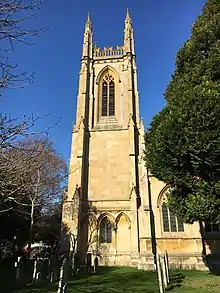 The first phase of construction consisted of the ashlared limestone nave and tower, designed by Hutchinson and Rickman respectively. The nave consists of six bays with a north and south aisle. The external walls sit on a moulded plinth and the window hoods, parapet and gables are richly carved. The tower has three stages, terminating in octagonal pinnacles and a pierced, crenellated parapet.[6] In 1858 Sir George Gilbert Scott was employed to add a chancel and north porch, both of which are richly decorated in the Gothic Revival style.[5] A statue of St Peter in chains sits over the north porch along with the Lucy arms.[6]