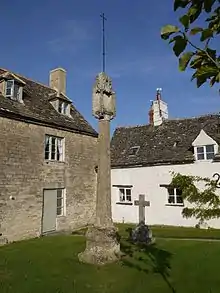 A broken shaft of a medieval limestone cross, on a crude octagonal base, can be seen against the gable of a gatehouse at the northern perimeter of the churchyard.[9]