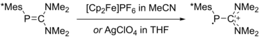 In 2003, Geoffroy et al. synthesised Mes*P•-(C(NMe2)2)+ through a one electron oxidation of a phosphaalkenes with [Cp2Fe]PF6.[25] A solution of Mes*P•-(C(NMe2)2)+ is stable in inert atmosphere in the solid state for a few weeks and a few days in solution. Hyperfine couplings on EPR show strong localisation of the spin to the phosphorus nuclei (0.75e in p orbital). In 2015, the Wang group was able to isolate the crystal structure of this species with use of the oxidant of a weakly coordinating anion Ag[Al(ORF)4]−.[26] The electron spin density, found by EPR, resides principally on phosphorus 3p and 3s orbitals (68.2% and 2.46% respectively). This was supported by DFT calculations where 80.9% of spin density was found to be localised on phosphorus atom.[26]