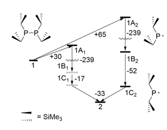 The phosphinyl radicals synthesised by Lappert and co-workers were found to be stable at room temperature for periods of over 15 days with no effect from short-term heating at 360 K.[4] This stability was assigned to the steric bulk of the substituents and the absence of beta-hydrogen atoms. A structural study of this species conducted using X-ray crystallography, gas-phase electron diffraction, and ab initio molecular orbital calculations found that the source of this stability was not the bulkiness of the CH(SiMe3)2 ligands but the release of strain energy during homolytic cleavage at the P-P bond of the dimer that favoured the existence of the radical.[13] The dimer shows a syn,anti conformation, which allows for better packing but has excessive crowding at the trimethylsilyl groups, while the radical monomer displays syn,syn conformation. Theoretical calculations showed that the process of cleaving the P-P bond (endothermic), relaxation to release steric strain, and rotation about the P-C bond to yield syn,syn conformation on the monomer radical (exothermic by 67.5 kJ for each unit) is an overall exothermic process.[13] The stability of this species can therefore be attributed to the energy release of strain energy by the reorganisation of the ligands as the dimer converts to the radical monomer. This effect have been observed in other systems containing the CH(SiMe3)2 ligand and was dubbed the "Jack-in-the-box" model.[14][15][16] Other ligand with similar flexibility, and ability to undergo conformational changes were identified as PnR2 (Pn - P, As, Sb) and ERR'2 (E = Si, Ge, Sn; R' = bulky ligand).[13]