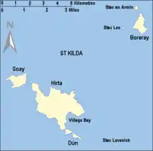 Stac an Armin (Scottish Gaelic: Stac an Àrmainn), based on the proper Scottish Gaelic spelling (formerly àrmuinn), is a sea stack in the St Kilda archipelago. It is 196 metres (643 ft.) tall, qualifying it as a Marilyn.[4] It is the highest sea stack in Scotland and the British Isles.[5][6][7]