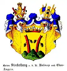 The family was first mentioned in 1244 in Köln in a written document with Waldewerus de Stackelberg and in 1306 in Riga with Henricus de Stackelberg. They were mentioned as vassals of the Prince-Bishops of Dorpat. The family members were raised to the rank of Baron in 1714 and later in 1727 to the rank of Count in Sweden. They were also awarded with the title of Imperial Count in 1776 and in 1786. The title of Baron in Russian Empire was granted to them on December 7, 1854. Different branches of the Stackelberg family use different surnames; for instance, a nobiliary particle preposition i.e. von. The Stackelberg family used to be one of the biggest landowning families in the Baltic region.[3]