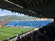 The Tribuna Giulio Cesare underwent modernization during the early 1990s, and the stadium was renamed the Stadio Atleti Azzurri d'Italia ("Blue Athletes of Italy") in 1994.[7] In 1997, following the death of 22-year-old forward Federico Pisani in a car accident, the Curva Nord was nicknamed the Curva Pisani in his honor.[14] Similarly, the Curva Sud was nicknamed the Curva Morosini in 2012 to posthumously honor 25-year-old youth academy player Piermario Morosini,[15] who died following collapse on the field during a Serie B match between Pescara and Livorno.[16] In 2015, the stadium also expanded its side stands to offer pitchside views only several meters (feet) from the benches, a revolutionary feature of Italian stadiums at the time.[10][4] This phase of improvements also included improved bench facilities for players and the introduction of luxury boxes atop the grandstand.[17] New seating areas for disabled spectators were also added. At the same time, the press box has been lowered and moved towards the pitch. These improvements came with a reduction in overall capacity by around 3,000 seats. The club paid €2.6 million for the first phase of redevelopment.[18]