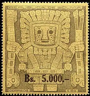 The Staff God has one of the most important iconographical elements in central Andean archaeology and this is prominent in both portable and fixed art using different media such as stone, textile, and ceramic.[9] A form of the staff god, for example, takes a central role in the Sun Gate of the Tiwanaku culture, a single-stone monolith. Tunics and ceramics from both the Tiwanaku and Wari cultures of the Middle Horizon period showcase a similar god. Another example is the giant offering jars found at Qunchupata. They were painted with the Staff-God's image, one that bears resemblance to the god's depiction at the back of the Tiwanaku's Ponce Monolith.[11]