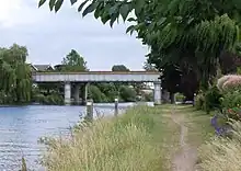 The bridge crosses Laleham Road and the river northeast to southwest from Staines-upon-Thames to Egham Hythe, Surrey, on the Staines Reach (between Penton Hook Lock and Bell Weir Lock). The main Thames Path National Trail is beneath it and southern end of the Hythe towpath on the other bank. Its linked viaducts cross various other roads including Chertsey Road (A320).