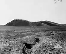 Viewing across the open eastern flank was possible from the top of the "curiously shaped heaps of broken earth" near Shellal.[39] Two tels, indicating possible sites of ancient cities, stood high above the plain and also provided excellent views. The spectacular, flat-topped Tel el Jemmi, with its perpendicular sides, one side dropping into the Wadi Ghazza, could be seen for miles. It had been used as a lookout during the first battle of Gaza.[41] Tel el Fara, on the Rafa to Beersheba road, was a flat-topped prominence with conical sides 7 miles (11 km) further south, and was approximately 16 miles (26 km) inland from the coast in the centre of the Gaza to Beersheba front line. This large mound, near the Wadi Ghazza at Shellal, was thought to have been built by the crusaders in the 13th century as an observation post; and it gave an "uninterrupted view for several miles northward and eastward."[39] At the base of Tel el Fara huge stone buttresses and several courses of cut stone could be seen at water level.[41][42]