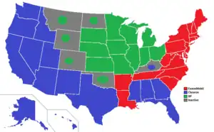 This map shows by state which company has the rights to the Standard Oil name. ExxonMobil has full international rights and continues to use the Esso name overseas. States that are gray have a dot representing their owners, but are not actively being used; ExxonMobil operates in all these states and have de facto claimed the trademark.