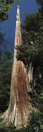 Two landmark trees were affected. One tree that has achieved a lot of fame is the National Geographic Tree, so named because it appeared in the magazine's October 1978 issue. With a circumference of 13.5 m (44+1⁄2 ft), it was once one of the more impressive big western red cedars of the park. It diminished over time, ravaged by storms, a lightning strike, and topped by park staff to a height of 39.6 metres (130 ft) before being uprooted in October 2007.[54][55][56]