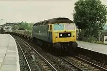 The station is on an alignment of 150 degrees, curving towards the east.[2] There are two active platforms: the western platform, platform 1, serves northbound trains; the eastern platform, platform 2, serves southbound trains. Platform 1 is 216 metres (236 yd) in length, and platform 2 211 metres (231 yd), but both have the southern 100 metres (110 yd) fenced off.[5] The southern end of the platforms bridge the residential street St Mark's Road.[6] Platform 2 is part of an "island" platform, the other face of which served the northbound "up fast" line through the station, which was removed in 1984 along with the southbound "down fast" and fourth platform which served it.[7] Access between the platforms is via an open, stepped footbridge.[3]