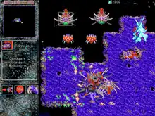 StarCraft's first expansion, Insurrection, was released for Windows on July 31, 1998.[53] The expansion was developed by Aztech New Media and authorized by Blizzard Entertainment.[54] Its story focused on a separate Confederate colony alluded to in the manual to StarCraft, following a group of Terran colonists and a Protoss fleet in their fight against the Zerg and a rising local insurgency. Insurrection was not received well, being criticized by reviewers for lacking the quality of the original game.[55] Insurrection was followed within a few months by a second expansion, Retribution. Developed by Stardock, published by WizardWorks and authorized by Blizzard Entertainment,[54] Retribution follows all three races attempting to seize control of a powerful crystal on a Terran Dominion colony. The expansion was not received with critical support, instead being regarded as average but at least challenging.[56] After the release of Retribution, Blizzard Entertainment announced a new official expansion pack that would continue on the story of StarCraft. StarCraft: Brood War was consequently created, developed jointly by Blizzard Entertainment and Saffire. Brood War continues the story of StarCraft from days after its conclusion, and was released for both Windows and Mac to critical praise[57][58] on December 18, 1998, in the US and in March 1999 in Europe.[59]