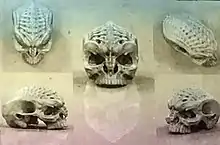 Page first designed a generic, "realistic" Klingon skull,[72][73] inspired by real biology,[71] and then developed the different Klingons from that base in an evolution-based approach.[73] The skull design includes spaces for "extra sensory receptors" running from the top of the head to the back, as Page wanted to show the Klingons to be apex predators with heightened senses. To not cover these receptors, the Klingons are depicted as being bald in the series, which is a design decision that was mandated by Fuller.[72] It was important to the producers to show diversity within the Klingons, so the series depicts both light and dark skinned members of the species,[71] and features different clothing, weapon, and armor designs for each of the 24 Klingon houses.[40][74] Glenn Hetrick, co-founder of Alchemy Studios with Page, explained that the Klingon Empire covers many planets beyond the homeworld of Qo'noS and so different subsets of the species would have evolved on those different planets, each with different environments and cultures.[72]