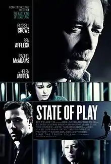 State of Play is a 2009 political thriller film directed by Kevin Macdonald. It is based on the 2003 British television serial of the same name. The film tells of a journalist's (Russell Crowe) probe into the suspicious death of the assistant and mistress of a Congressman (Ben Affleck). The supporting cast includes Rachel McAdams, Helen Mirren, Jason Bateman, Robin Wright, and Jeff Daniels.