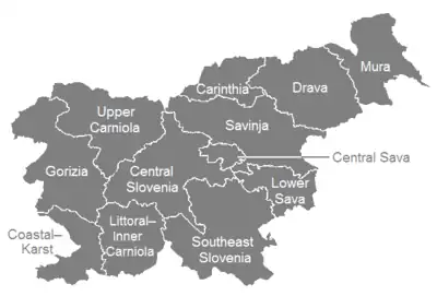 | Areas | 264 km2 (102 sq mi) (Central Sava) – 2,675 km2 (1,033 sq mi) (Southeast Slovenia) |
