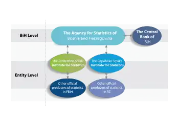 Bosnia and Herzegovina currently has three governmental statistics offices, each one responsible for a different area of the government.[1] One agency is in charge of whole country statistics (the BHAS), while the other two oversee statistics in BiH’s constituent entities, the Republika Srpska and the The Federation of Bosnia and Herzegovina. This system reflects strong decentralization in the region, and several independent reports have stated that this impedes an efficiently functioning government body. To this end, the three agencies still do not fully agree on several various statistical concepts and definitions.[2] All three agencies were established in 2004 with the passage of the Law on Statistics of Bosnia and Herzegovina[3]. Also, the Central Bank, though not a statistics agency on its own, is tasked with calculating yearly balances and preparing other financial statistics.[4][5]