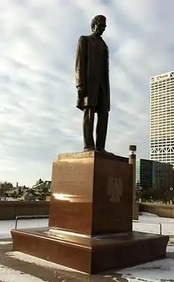 A statue of Abraham Lincoln by American artist Gaetano Cecere is installed along Lincoln Memorial Drive in Milwaukee, Wisconsin, United States. The 10'6" bronze sculpture depicts a young beardless Abraham Lincoln. The former president stands looking down with both hands at his sides.