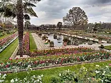 A statue of Diana, Princess of Wales, is located in the Sunken Garden of London's Kensington Palace. Commissioned by Diana's two sons William and Harry on the 20th anniversary of her death, the statue was designed and executed by sculptor Ian Rank-Broadley and placed in the newly redesigned garden by Pip Morrison before being unveiled as a memorial to Diana on 1 July 2021, which would have been her 60th birthday.[1]