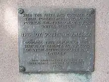 WITH THE FAITH AND COURAGE OF / THEIR FOREFATHERS WHO MADE / POSSIBLE THE FREEDOM OF THESE / UNITED STATES / THE BOY SCOUTS OF AMERICA / DEDICATE THIS REPLICA OF THE / STATUE OF LIBERTY AS A PLEDGE / OF EVERLASTING FIDELITY / AND LOYALTY / 40TH ANNIVERSARY CRUSADE TO / STRENGTHEN THE ARM OF LIBERTY / 1950.[1]