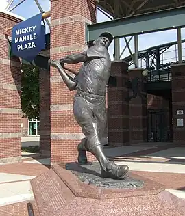 Media related to Statue of Mickey Mantle (Oklahoma City) at Wikimedia Commons- Mickey Mantle Statue #2 at Roadside America