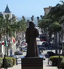 Junípero Serra was a Roman Catholic Spanish priest and friar of the Franciscan Order who founded nine Spanish missions in California. In 1782, Serra founded Mission San Buenaventura, his ninth and final mission, on a site that became downtown Ventura. Objections to the public display of Serra statuary cite the mistreatment of the Native American people during the mission era. Following Serra's canonization in 2015, Serra statues were vandalized at Carmel Mission (smeared with green paint, "Saint of Genocide" written on a headstone),[45] Monterey's Lower Presidio Historic Park (decapitated),[46] San Fernando Mission (hands painted red and word "murderer" scrawled),[47] Mission Santa Barbara (decapitated and covered in red paint),[48] and San Gabriel Mission (cut with electric saw and splashed with red paint).[49]
