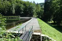 The earth-fill dam was built between 1950 and 1954.[1] It is 8 metres high[3] above the valley floor and 8.5 m[2] above the foot of the dam. The crest of the dam is at an elevation of about 377.5 m above NN[4], it is around 80 metres[3] long, 4 metres wide at the top[3] and about 40 metres wide at the base.[3] The dam has a volume of circa 15,000 m³[3] of earth-fill.