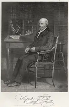 Girard was born in Bordeaux, France on May 20, 1750, the son of a sea captain.[3]: 767 He lost the sight in his right eye at the age of eight and had little education. In 1760, he travelled to the colony of New York as a cabin boy and stayed there, working in the coastal trader system along the east coast and as far south as the Caribbean.[3]: 766 He was licensed as a captain in 1773, visited New York in 1774, and with the assistance of a New York merchant began to trade to and from New Orleans and Port au Prince. In May 1776, after the outbreak of the American Revolutionary War, Girard sailed into the port of Philadelphia to avoid a group of Royal Navy warships and settled there, running a grocery and liquor shop.[4] In 1783, Stephen's brother John Girard left him with a slave, a woman in her twenties named Hannah, during a visit from Saint-Domingue.[5]:89-91 Pennsylvania's 1780 Act for the Gradual Abolition of Slavery had many loopholes and although it was amended throughout Girard's life, Hannah remained his slave until his death in 1831. An 1828 listing of taxable inhabitants reported that she was the only enslaved person in Philadelphia at that time.