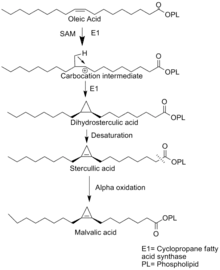 The biosynthesis of sterculic acid begins with the cyclopropanation of the alkene of phospholipid-bound oleic acid, an 18-carbon cis-monounsaturated fatty acid. This transformation involves two mechanistic steps: electrophilic methylation with S-adenosyl methionine to give a carbocationic reactive intermediate, followed by cyclization via loss of H+ mediated by a cyclopropane-fatty-acyl-phospholipid synthase enzyme. The product, dihydrosterculic acid, is converted to sterculic acid by dehydrogenation of the cis-disubstituted cyclopropane to cyclopropene.[2] An additional step of α oxidation removes one carbon from the carboxy chain to form the 17-carbon-chain structure of malvalic acid.