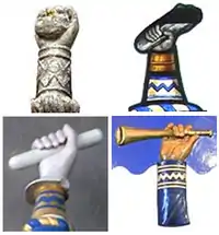Various forms of the Rolle crest, the standard form of which is: A cubit arm erect vested or charged with a fess indented double cotised azure in the hand a flint-stone proper. Top left: Library Room, Stevenstone (with flint-stone); top right: Stained glass window, Bicton House (with roll of parchment); bottom left: Chittlehampton Church (with baton); bottom right: Barnstaple Guildhall (badge of HMS Stevenstone, with tinctures reversed, double cottised and with hunting horn). It was also used, grasping either a roll or a palm frond, as the badge of the Royal North Devon Hussars,[8] the predecessor regiment of which had been raised largely by Lord Rolle