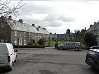 Stable block, Stevenstone House, converted c. 1950 into terraced housing. The ivy-covered ruins of Stevenstone House are visible in the background