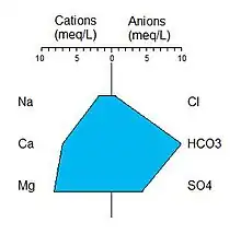 A Stiff diagram, or Stiff pattern, is a graphical representation of chemical analyses, first developed by H.A. Stiff in 1951. It is widely used by hydrogeologists and geochemists to display the major ion composition of a water sample. A polygonal shape is created from four parallel horizontal axes extending on either side of a vertical zero axis. Cations are plotted in milliequivalents per liter on the left side of the zero axis, one to each horizontal axis, and anions are plotted on the right side. Stiff patterns are useful in making a rapid visual comparison between water from different sources. An alternative to the Stiff diagram is the Maucha diagram.