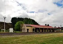 | Tawhai | 41 mi 33 ch (66.6 km) | 28 September 1890 | 23 November 1946 | 181 m (594 ft) | Tawhai (initially called Slab Hut)[137] was the terminus when the line was extended from Māwheraiti on 28 September 1891,[138] until 29 February 1892, when it opened to Reefton. It had two trains a day, the fastest taking 2hr 17min for the 52.53 km (32.64 mi) from Stillwater.[61]