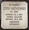 HERE LIVED JOSEK MACHNOWSKI BORN 1904 ARRESTED 11.1.1943 DETAINED MALINES DEPORTED 15.1.1943 AUSCHWITZ MURDERED |