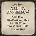HERE LIVED ADOLFINA SCHREIBEROVÁ BORN 1903 DEPORTED 1943 TO THERESIENSTADT MURDERED 1943 IN AUSCHWITZ |