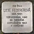 HERE LIVED LIDIE FEDEREROVÁ BORN 1901 DEPORTED 1943 TO THERESIENSTADT MURDERED 1943 IN AUSCHWITZ |