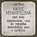 HERE LIVED MARIE HÖNIGSFELDOVÁ BORN 1910 DEPORTED 1943 TO THERESIENSTADT MURDERED 1943 IN AUSCHWITZ |