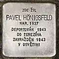 HERE LIVED PAVEL HÖNIGSFELD BORN 1937 DEPORTED 1943 TO THERESIENSTADT MURDERED 1943 IN AUSCHWITZ |