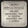 HERE LIVED RŮŽENA PICKOVÁ BORN 1882 DEPORTED 1943 TO THERESIENSTADT MURDERED 1943 IN AUSCHWITZ |