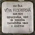 Věra Federerová, also Dvora, was born on 4 May 1921. Most probably her parents were Emil Federer, a merchant, and Lidie, Lea or Leha. Her last residence before deportation was in Líny close to Mladá Boleslav. On 16 January 1943, she was deported to Theresienstadt concentration camp and four days later, on 20 January 1943 further on to Auschwitz concentration camp. Her number on transport Cm was 264 of 491 and on transport Cq 158 of 2,000. She lost her life in Auschwitz.[5][6]