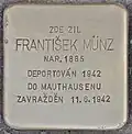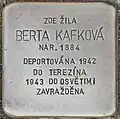 Beila Berta Kafková was either born on 22 May 1883 or on 22 May 1884.[34] Her parents were Bernard Issakhar Kafka and Elenora Kafková. She was married to Max Beniamin Meir Kafka. The couple had two sons, Osvald (born 1908) and Otakar (born 1919), see above. She was a housewife. On 26 November 1942, she and her sons were deported from Klatovy to Theresienstadt concentration camp by transport Cd. Her transport number was 127 of 651. According to two serious sources she died in Theresienstadt, most probably on 13 December 1942. Therefore, the inscription on the Stolperstein, indicating that she was deported to Auschwitz in 1943 and was murdered there, might be wrong.[35][36]