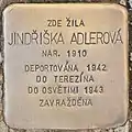 Jindřiška Adlerová was born on 9 June 1910. Her parents were Jakub Adler and Růžena née Fröhlichová. She had an older sister, Anna (born 1906), and three brothers, Josef (born 1904), Ota (born 1908) and Jaroslav.[7] At a certain period she lived in Prague II, Vladislavova 16. She, her mother and her brother Ota were deported on 26 November 1942 from Klatovy to Theresienstadt concentration camp by transport Cd. Her transport number was 171 of 651. On 23 January 1943, she was deported to Auschwitz concentration camp by transport Cr. Her transport number was 1048 of 2,017. She was murdered there.[8][9]