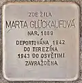Marta Glückaufová was born in 1889. Most probably she was the daughter of Albert Glückauf and Franziska née Lebenhart and had a sister named Olga.[28] In 1942 she was deported to Theresienstadt concentration camp, in 1943 to Auschwitz concentration camp. There she was murdered by the Nazi regime.[29]