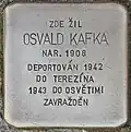 Osvald Kafka was born on 9 November 1908. His parents were Max Beniamin Meir Kafka and Beila Berta Kafková. His father traded with eggs. He had a younger brother, Otakar (born 1919). He was a train worker. Together with mother and brother he was deported on 26 November 1942 from Klatovy to Theresienstadt concentration camp by transport Cd. His transport number was 128 of 651. On 13 December 1942, his mother died in Theresienstadt. On 6 September 1943, he was deported to Auschwitz concentration camp by transport Dl. His transport number was 905 of 2484. He was murdered in one of the gas chambers of Auschwitz.[30][31]