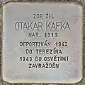 Otakar Kafka, also Otokar, was born on 10 August 1919. His parents were Max Beniamin Meir Kafka and Beila Berta Kafková. His father traded with eggs. He had an older brother, Osvald (born 1908). Together with mother and brother he was deported on 26 November 1942 from Klatovy to Theresienstadt concentration camp by transport Cd. His transport number was 129 of 651. On 13 December 1942, his mother died in Theresienstadt. Seven days later, on 20 December 1942, he was murdered by the Nazi regime in Theresienstadt.[32][33]