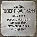 Robert Kaufmann was born 1913. He was the son of Hugo Kaufmann and Olga née Ehrmann. He had two brothers, Bedřich (born 1911) and Hanuš (born 1917). He was an industrialist and married. His last residence before deportation was in Prague XII, Lucemburská 16. On 4 December 1941 he was deported from Prague to Theresienstadt concentration camp by transport J. His number on this transport was 745 of 1,000. On 19 October 1943 he was deported to Auschwitz concentration camp by transport Es. His number on this transport was 1163 of 1,500. He lost his life there.[12][13]